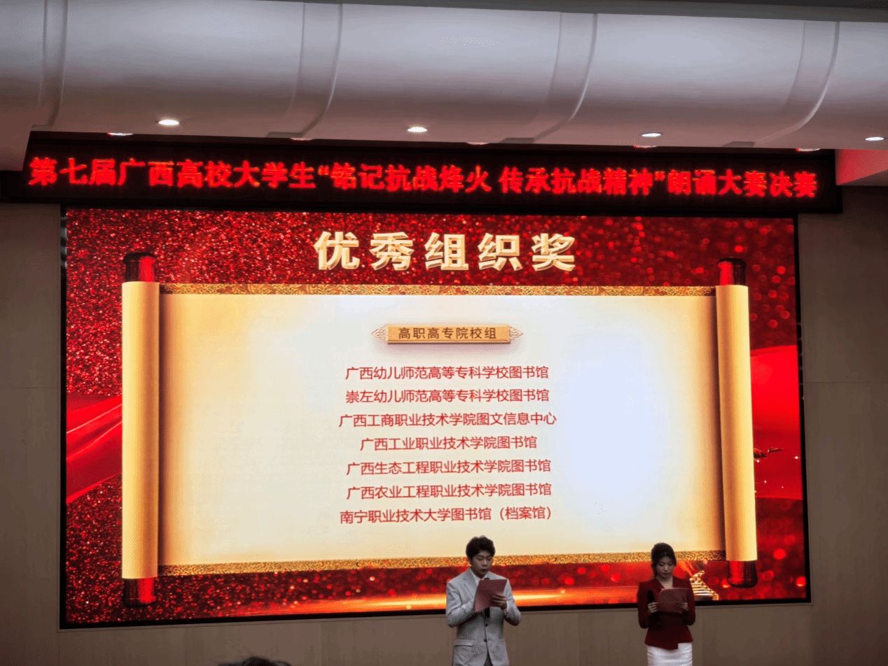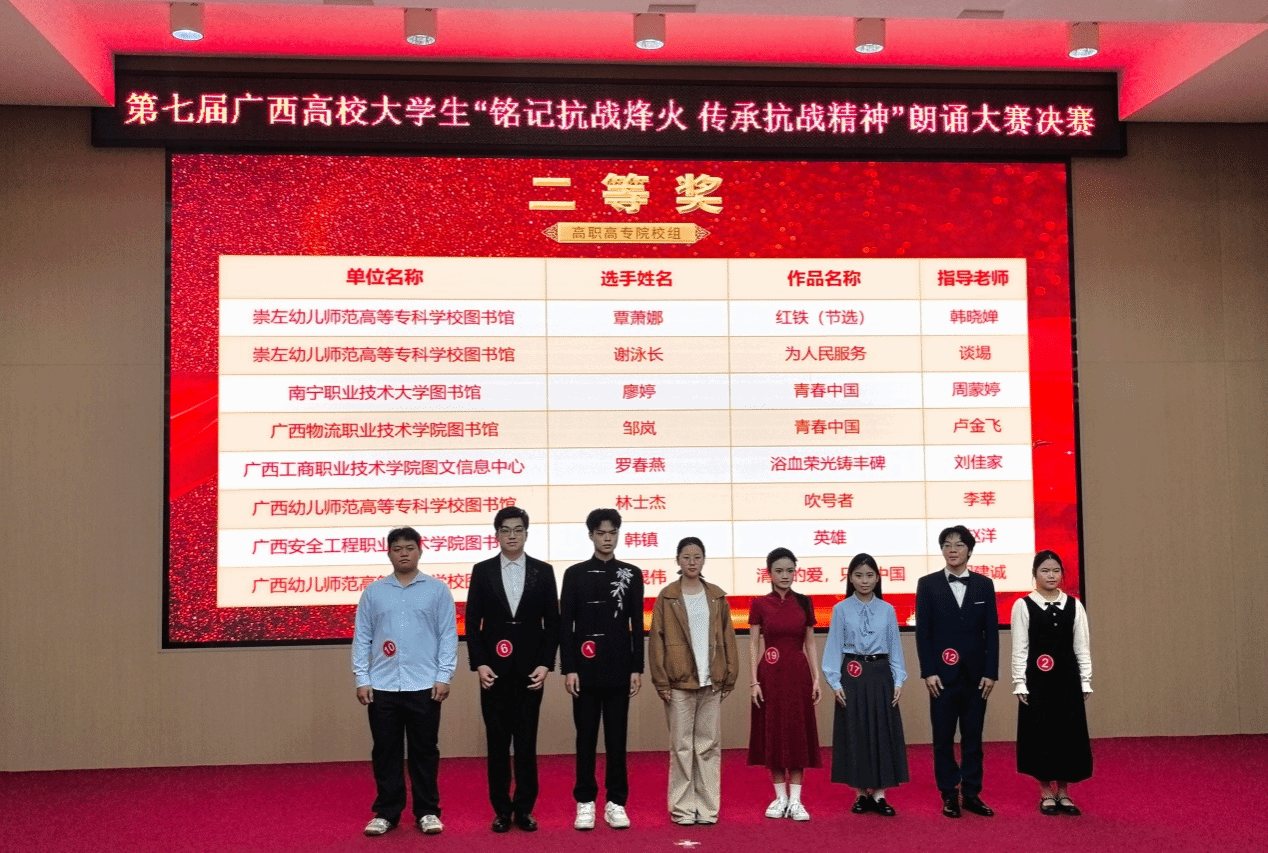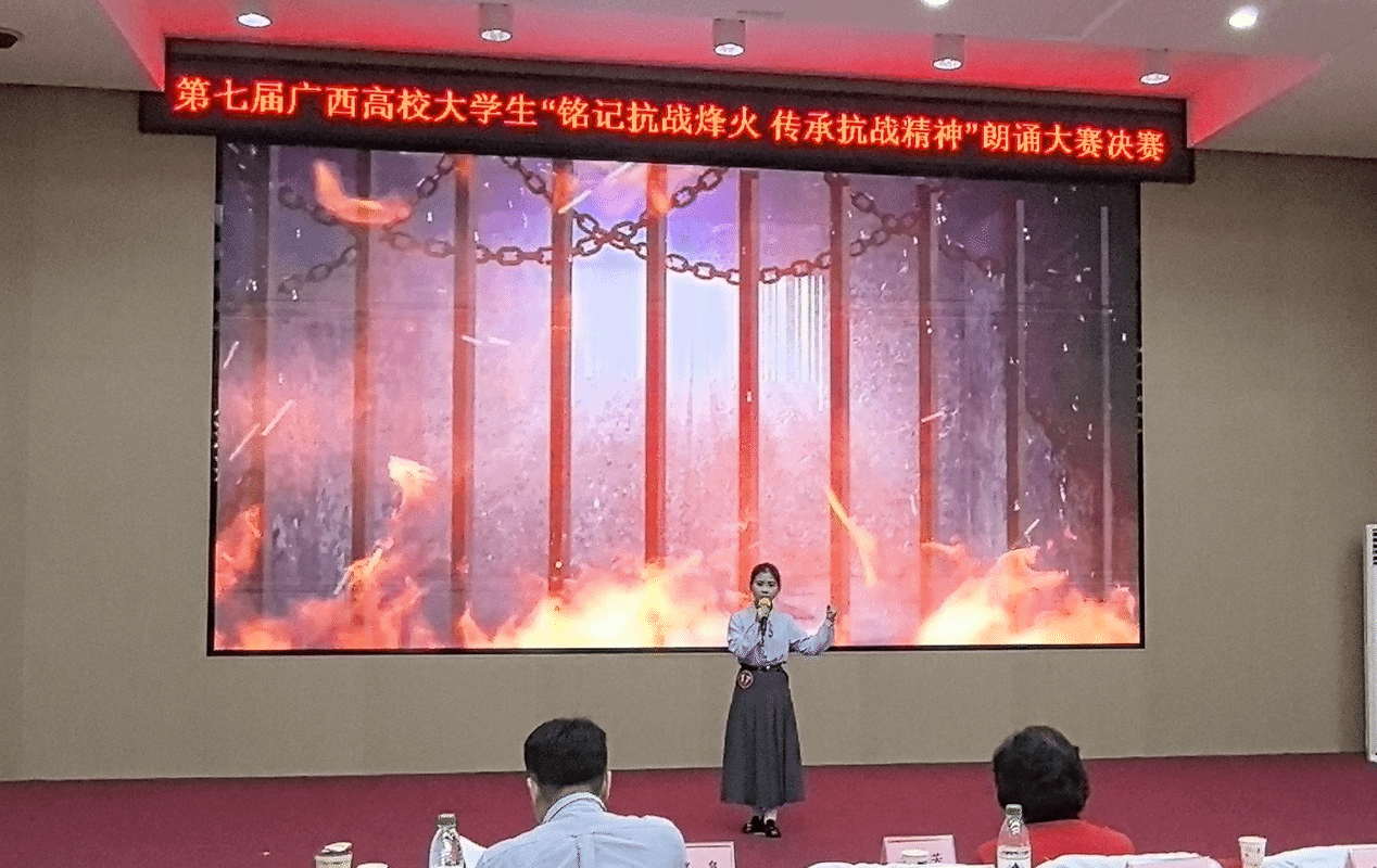 2025年是中国人民抗日战争暨世界反法西斯战争胜利80周年。为传承伟大抗战精神,弘扬爱国主义情怀,11月16日上午,由广西高等教育学会图书馆专业委员会主办、南宁师范大学图书馆承办的第七届广西高校大学生“铭记抗战烽火 传承抗战精神”朗诵大赛决赛在南宁师范大学举行。我校刘佳家同志带领经贸与康旅学院学生罗春燕参加了本次决赛。